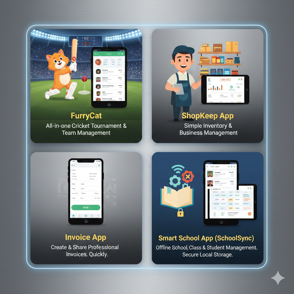 Our Products: FurryCat – an all-in-one cricket tournament and team management platform; ShopKeep App – a simple inventory and business management solution for shops and small businesses; Invoice App – a quick tool to create and share professional invoices; Smart School App (SchoolSync) – an offline school, class, and student management system with secure local storage..